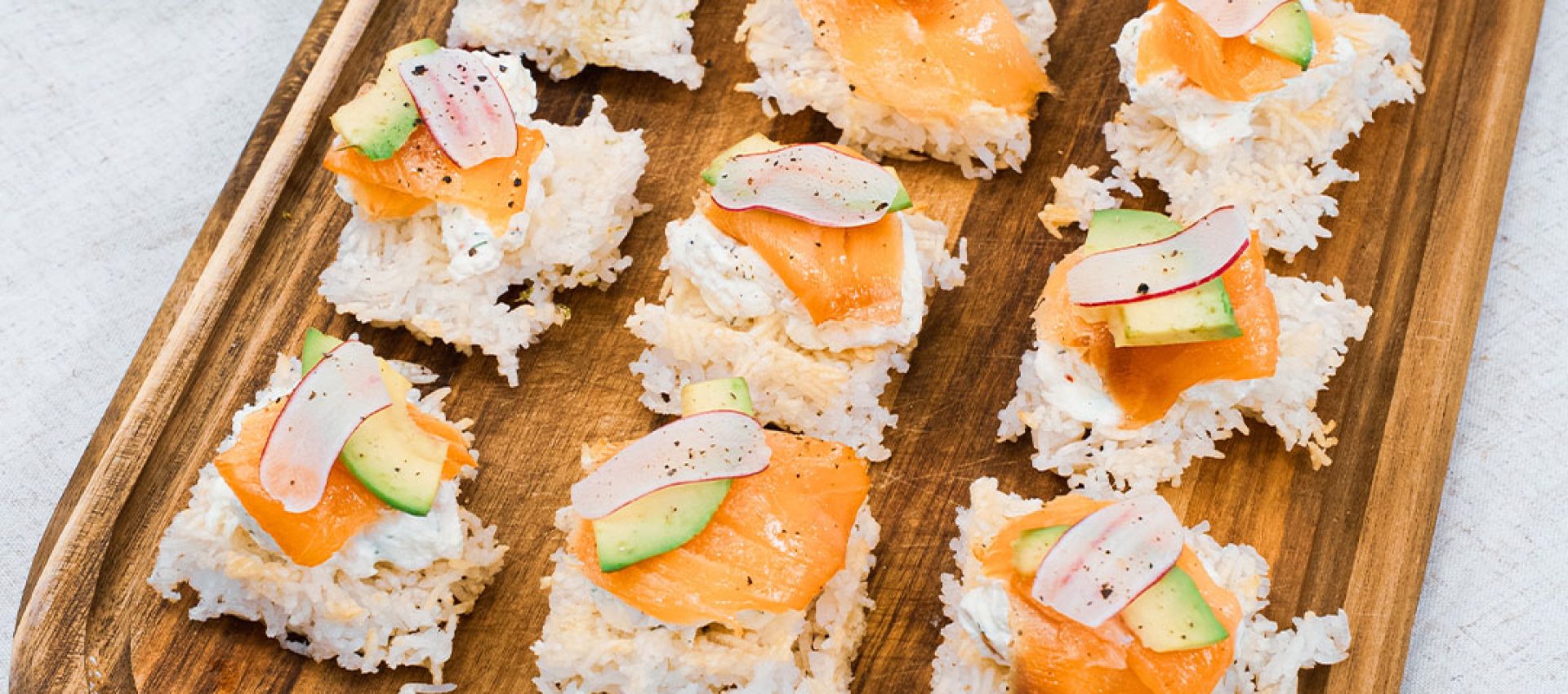 3Écraser les avocats ou les couper en fines tranches, arroser de jus de citron. Trancher des radis en fines rondelles. Préparer des tranches de Saumon Fumé.