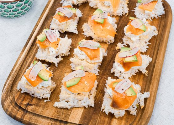 4Sur la gaufre chaude, étaler un peu de fromage frais ou une sauce (optionnel : mélange de fromage blanc, citron et ciboulette). Ajouter de l’avocat, les radis et les tranches de Saumon Fumé sur le dessus. Parsemer de graines de sésame et déguster immédiatement.