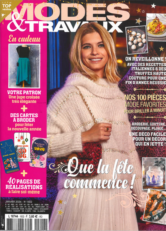 Ce superbe magazine, sous le titre « Que la Fête Commence », nous propose de découvrir 40 pages de réalisations à faire soi-même : des recettes italiennes pour les fêtes de fin d’année, les 100 pièces favorites pour briller à minuit, un patron pour se faire en un tour de main une jupe chic dans le tissu de son choix…mais aussi des cartes de vœux à broder !