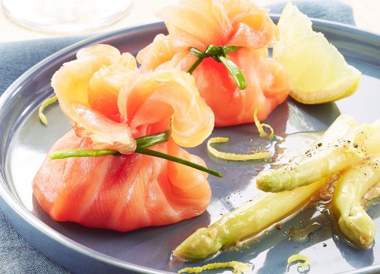 7Déposer 2 aumônières par assiette, quelques asperges recouvertes de vinaigrette, puis accompagner d'une tranche et de quelques zestes de citron.