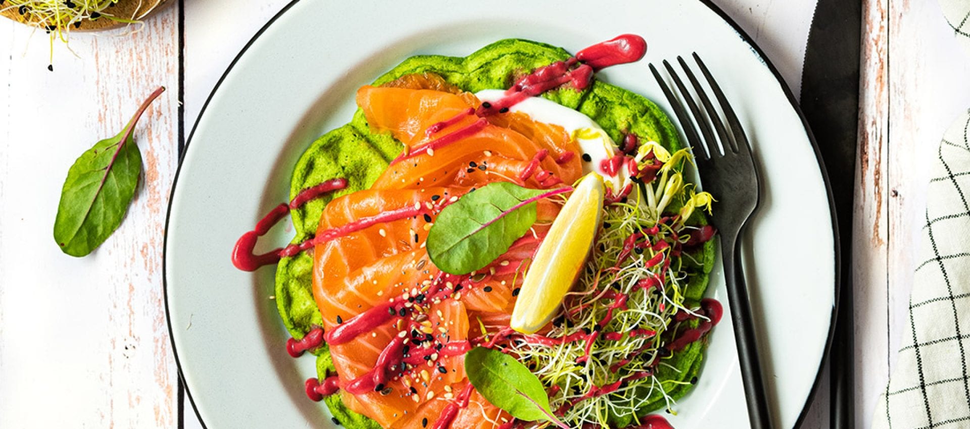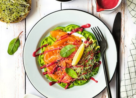 Gaufres vertes au Saumon ou Truite Fumés et sauce aigre-douce à la betterave