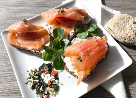 3Ajouter une tranches se Saumon Fumé sur chacune des tartines à la manière d'une chiffonnade.