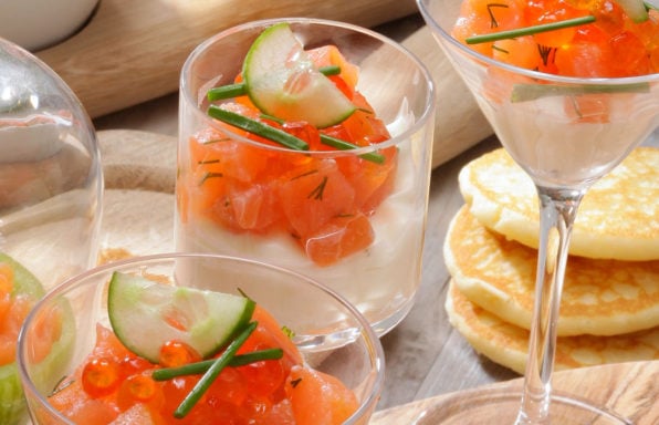 7Sur chaque galette de riz, déposer une tranche de saumon fumé, 1 cuillère de crème fraîche, les dés de concombre, la ciboulette et 2 cuillères d’œufs émiettés.