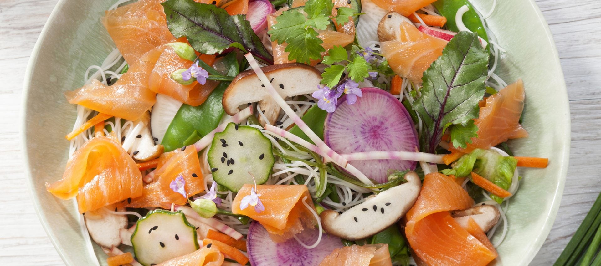 3Couper le concombre et les radis en fines rondelles. Détailler la betterave en petits bâtonnets et émincer les oignons nouveaux. Râper la carotte et couper les champignons en fines lamelles. Couper les tranches de Saumon Fumé en grandes lanières.