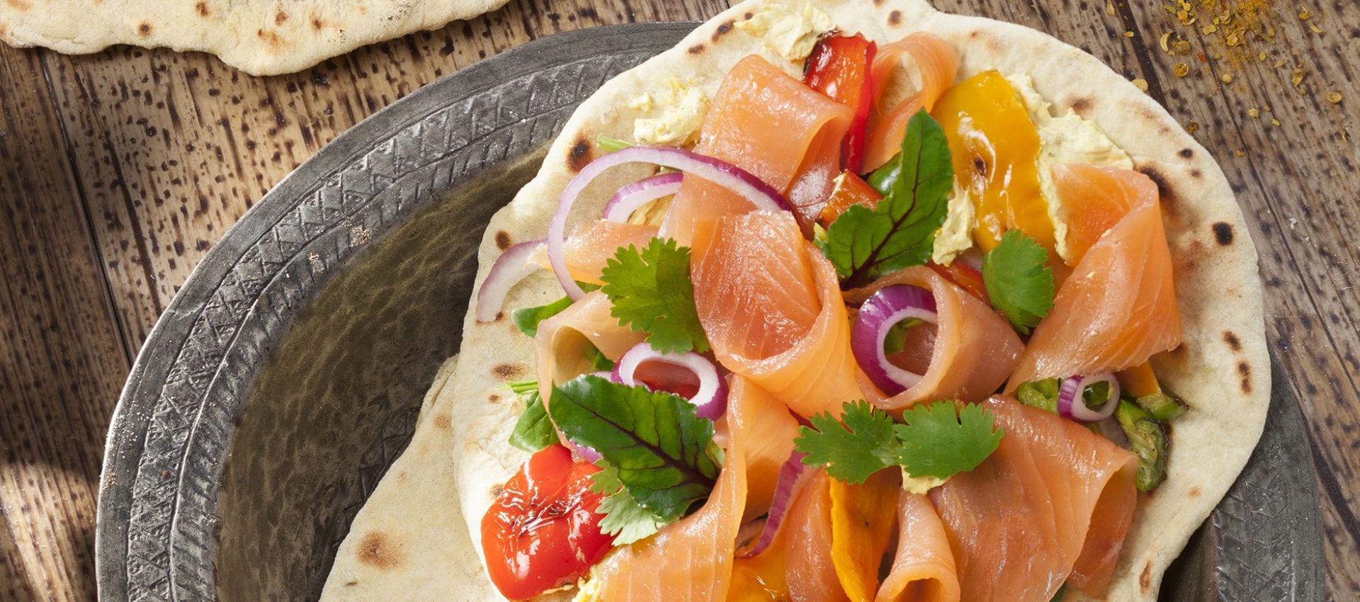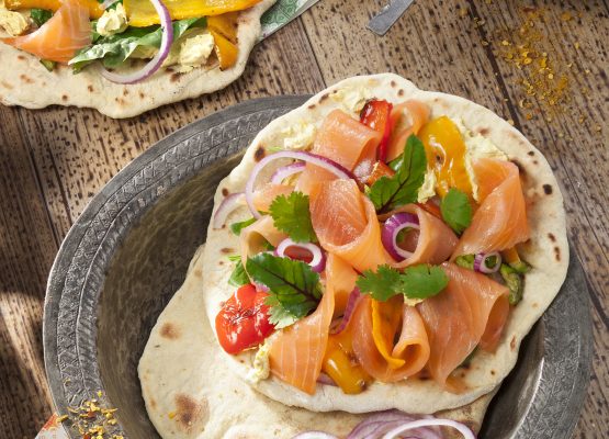 6Au moment de servir, tartiner les chapatis de fromage au curry. Ajouter les poivrons, l’oignon, les pluches de coriandre et les pousses de betterave.