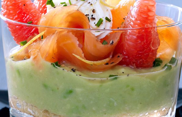 Tiramisu de saumon fumé, avocat, pamplemousse rose
